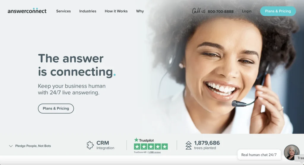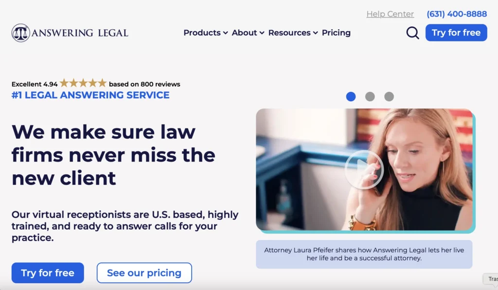 24/7 virtual receptionist and managed live chat with appointment scheduling and lead qualification. AnswerConnect has a dedicated legal answering service page and works with many law firms, but it serves multiple industries (not legal only).