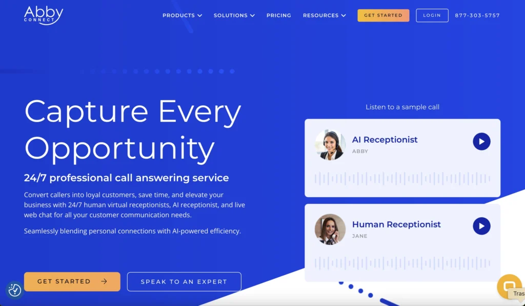 24/7 virtual receptionist with Human + AI options and managed live web chat. Abby has a dedicated legal page and works with many law firms, but it serves multiple industries